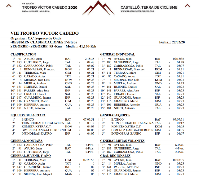 El líder del Bathco se metió en la escapada del día junto a Arnau Gilabert (Kometa), Jorge Gutiérrez y Pablo Carrascosa, ambos del Ciudad de Talavera. La diferencia fue aumentando con relación al pelotón. En la meta volante de Viver Ayuso pasó primero. En el kilómetro 43 cedía Gilabert y se quedaba un trío en cabeza. En el kilómetro 62 el alicantino se iba en solitario y ya nadie pudo hacer nada por detenerlo. «Me ha salido un día redondo. Sabía que tenía que hacer una carrera dura para hacer diferencias y así ha sido. En el primer puerto nos hemos ido cuatro corredores y nos hemos entendido bien. .Luego, a 35 de meta, he intentado irme solo y me ha salido la jugada», ha comentado.