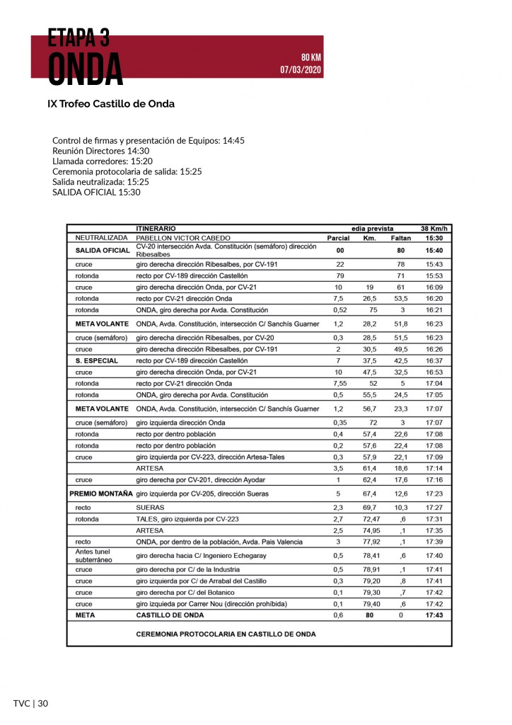 Onda abrirá el segundo fin de semana de la competición. En su IX edición presenta el mismo recorrido que en versiones anteriores dando vueltas al ya típico circuito de Ribesalbes para afrontar un puerto puntuable en el kilómetro 67 de la carrera. Por último, la subida al Castillo de Onda culminará esta bonita etapa. La que se corre el sábado cuenta con 80 kilómetros. La salida está fijada a las 15.30.