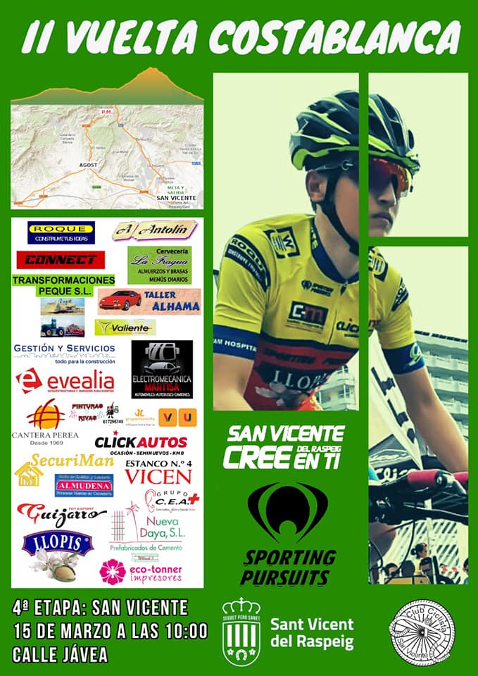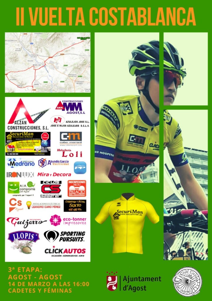 La Federación de Ciclismo de la Comunidad Valenciana (FCCV) informa que los organizadores de la II Vuelta Costa Blanca cadete – etapas 3 y 4- que debían celebrarse el sábado 14 y domingo 15 de marzo en Agost y San Vicente del Raspeig, por indicación de los respectivos ayuntamientos, han anunciado que SE APLAZAN las dos pruebas. La situación generada por la crisis del Covid19 ha obligado a buscar otra fecha para decidir una ronda que lidera Alejandro Tapia tras las jornadas de Alfaz y Calpbas.