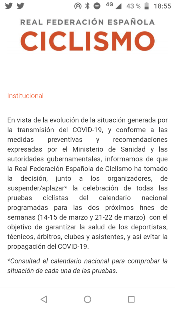 La Federación Española de Ciclismo (RFEC) ha informado en un comunicado que suspende las pruebas del calendario nacional programadas para los dos próximos fines de semana, «en respuesta a la evolución de la situación generada por la transmisión del COVID-19» y «en coordinación con los organizadores».