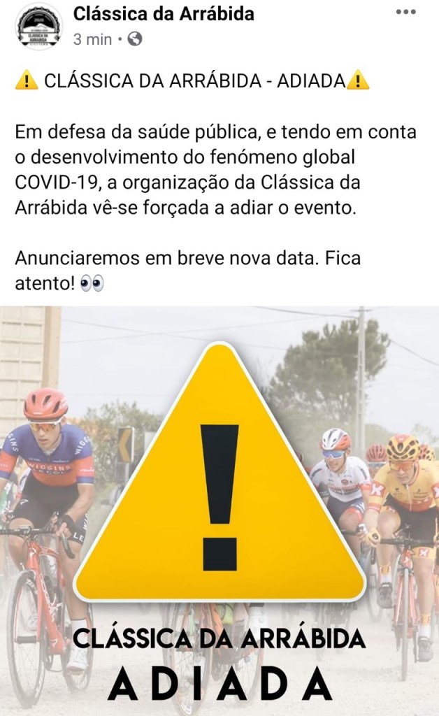 La Federación Portuguesa de Ciclismo (FPC) ha decidido suspender toda su actividad deportiva hasta el 3 de abril para tratar de frenar la propagación del coronavirus. De esta manera, han quedado aplazadas la Clásica Arrabida, prevista para el domingo 15 marzo, y la Volta Alentejo, que se iba a disputar del 18 al 22 marzo.