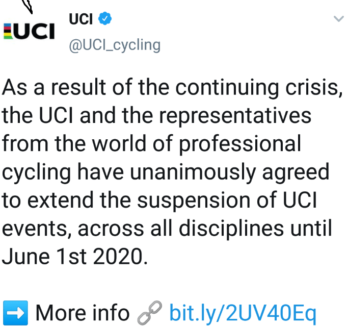 Después de la reunión, dada la gravedad de la situación de salud en todo el mundo, la UCI y sus partes interesadas decidieron por unanimidad prolongar la suspensión de las competiciones de ciclismo hasta el 1 de junio de 2020 , y hasta nuevo aviso. La UCI también decidió que esta extensión se aplicaría a todas las disciplinas de ciclismo y a todas las categorías de ciclistas.