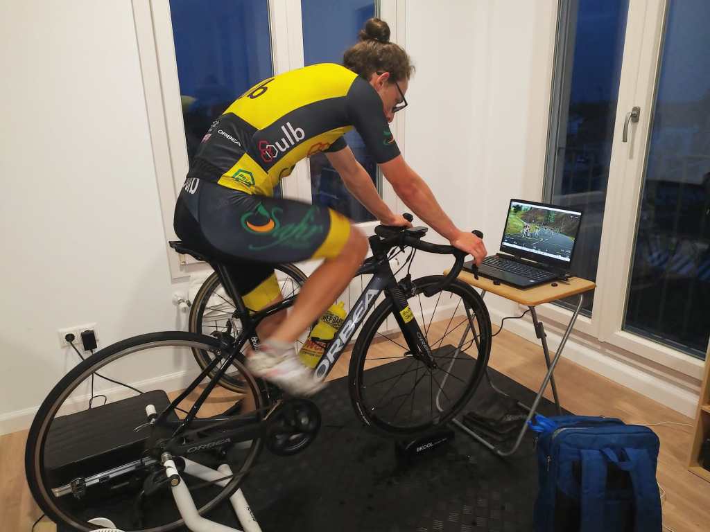 Este tema nos ha descolocado a todos los ciclistas ya que estábamos empezando la temporada y yo, por ejemplo, estaba en un bloque muy bueno de entrenamiento buscando ese primer punto de forma encaminado a las pruebas de la Copa de España más duras. Claramente esto te rompe totalmente la planificación. En un principio adaptas alguna rutina nueva: alimentación, estiramientos más de seguido… ya que tienes algo más de tiempo. Seguí haciendo rodillo todos los días, pero al ver que esta situación se iba a alargar hasta mayo o junio el preparador adelantó el parón que estaba previsto en mayo. Así que ahora, esta semana, estoy un tanto frenado. Lógicamente no podemos parar y menos ahora que estamos metidos en casa todo el día así que intento hacer algo de ejercicios de core o de estiramientos por la mañana en casa que compagino con las clases Online y los trabajos que nos mandan. Aprovecho por la tarde para hacer otra sesión de fuerza en el jardín o algún circuito de ejercicios para activarme ya que no aguanto todo el día parado.