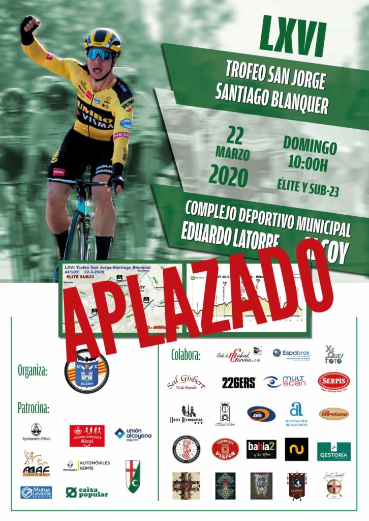 La UCA tuvo que aplazar hace unas fechas el Trofeo San Jorge–Santiago Blanquer para ciclistas élite y sub 23 que se iba a disputar el 22 de marzo sobre un recorrido de 105 kilómetros.