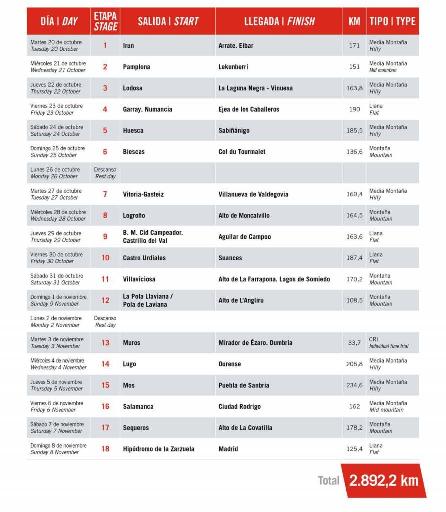 Tal como ya se conocía, tras anularse la salida de la ronda nacional desde los Países Bajos, la carrera iniciará su andadura en Irún el 20 de octubre. En esa primera jornada el final estará instalado en Arrate. Será la primera de las tres llegadas en alto que el pelotón debe superar en los siete días iniciales. La Laguna Negra y el Tourmalet serán los otros dos; La Farrapona y Angliru esperan en la segunda semana; y la contrarreloj de Ézaro y La Covatilla serán los dos puntos decisivos de la última.