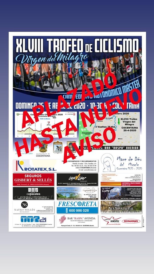 El Club Ciclista Contestano, que preside Vicente Belda, tenía previsto organizar el 25 de abril el 48 Trofeo Virgen del Milagro, válido para los campeonatos autonómicos máster; y el 49 Trofeo San Hipólito, el 26 de julio, reservado a ciclistas júniors y cadetes. Con la llegada de la pandemia, provocada por el COVID-19, la primera prueba se aplazó inicialmente hasta el 20 de septiembre y la segunda quedó en el aire. En aquellas fechas el excorredor contestano ya dejó claro en una entrevista que el futuro del ciclismo iba a entrar en una espiral peligrosa y el tiempo le ha dado la razón.