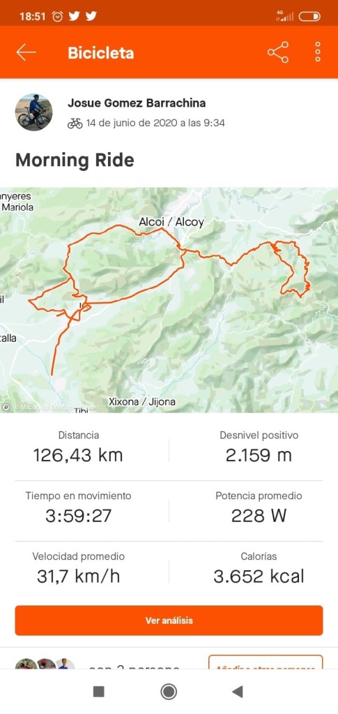 «La última ruta larga fue el domingo pasado, de unas 4 horas. De momento no estoy haciendo más ya que no se sabe cuando corremos exactamente. La hice con mi compañero Jordi Gandía y gente de mi pueblo, Ibi. Cuando hago fondo me gusta salir con gente y sobre todo disfrutar»