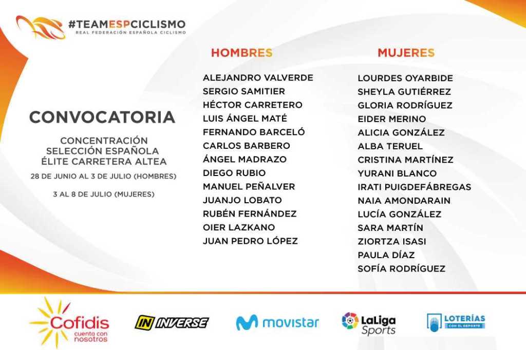 La Selección Española masculina de ciclismo en carretera permanecerá concentrada del 28 de junio al 3 de julio, mientras que el combinado femenino estará en el hotel Cap Negret de Altea del 3 de julio al 8 del mismo mes.