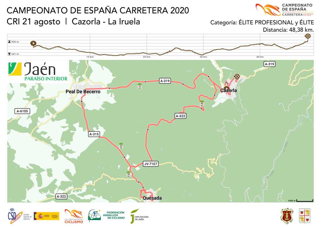 El Campeonato de España arrancará el viernes 21 de agosto con una contrarreloj individual con salida en Cazorla y llegada en La Iruela. Por la mañana se disputarán las pruebas de féminas y sub 23 masculina con un recorrido de 29,4 km., mientras que por la tarde como viene siendo habitual tendrá lugar la prueba para profesionales con un largo recorrido de 48 km.