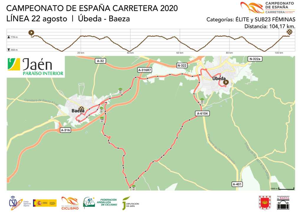 El sábado 22 se celebrará el recorrido en línea para féminas élite y sub 23 y para los sub 23 hombres. Al contrario que en años anteriores, la sesión matutina servirá para proclamar a las nuevas campeonas de España femeninas, que tendrán que hacer frente a 104 kilómetros con salida en Úbeda y llegada en Baeza.