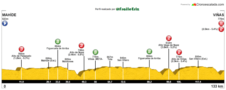 La Vuelta a Zamora concluirá el viernes 17 de julio con los 131’6 km entre Mahide y Viñas. Una jornada exigente, más con el esfuerzo realizado el día anterior, que recorrerá el Campo de Aliste y realizará varios pasos por las distintas localidades. En el km 11’5 se subirá el Alto de Palazuelo, en el km 49 el Alto de Nuez y en el km 55’5 el primer paso por línea de meta. Tras superar la meta volante de Figueruela de Arriba (km 87’3), se ascienden de forma consecutiva Vega de Nuez (km 99) y Viñas (km 105), una subida de 2ª categoría que será en su tercera y última ascensión la meta de esta edición de la carrera.