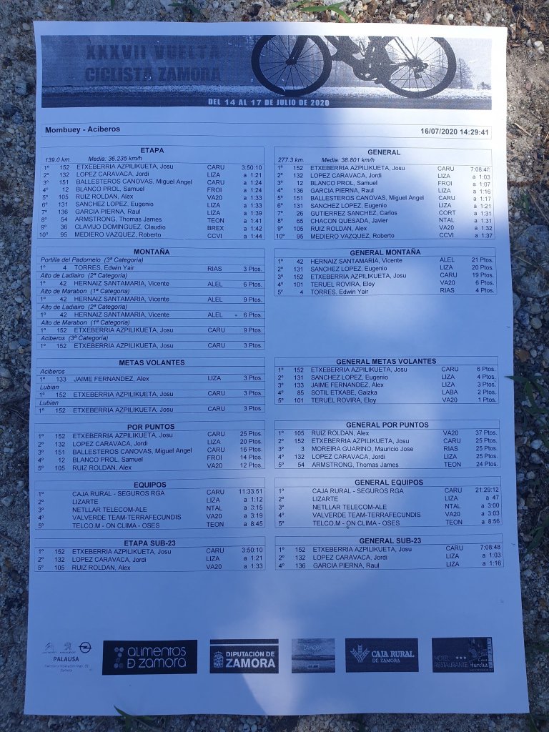 El ciclista navarro Josu Etxeberría (Filial del Caja Rural) ha logrado el triunfo en la tercera etapa de la Vuelta Ciclista a Zamora con inicio en Mombuey y final en Aciberos después de 139 kilómetros de recorrido. El corredor de Iturmendi, nuevo líder de la prueba, fue el más fuerte de una escapada de 18 corredores en la que iban los alicantinos Eugenio Sánchez (Lizarte Team) y Miguel Juan (Netllar Telecom Alé). Etapón del calpino Eugenio Sánchez, escapado desde el kilómetro 12 y demostrando en las subidas que es uno de los mejores escaladores de la categoría. Al final terminó sexto.
