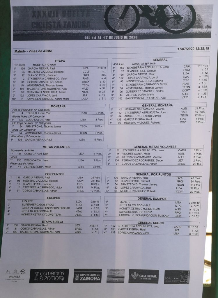 Josu Etxeberria, ganador de la Vuelta a Zamora, ha comentado al final de la prueba: «Ha sido un día muy complicado, toda la etapa persiguiendo y la verdad es que en cualquier momento se no podía haber escapado la carrera. Llegamos a la salida con el objetivo de ganar la general y gracias al equipo lo hemos podido conseguir, sin ellos habría sido imposible. Estoy muy contento con el resultado, es mi primera general pero quiero seguir pedaleando día a día».