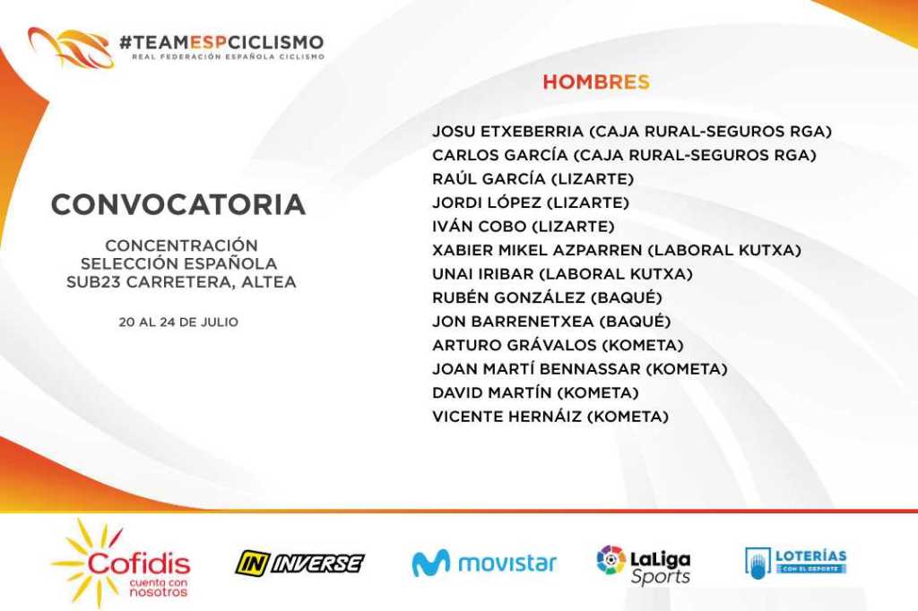 La lista la componen ciclistas que cumplen los criterios de pertenencia al Plan Estratégico de Tecnificación y Alto Rendimiento de la RFEC junto a un ramillete de corredores escogidos por el seleccionador para formar parte del combinado nacional la forman : Josu Etxeberria (Caja Rural-Seguros RGA), Carlos García (Caja Rural-Seguros RGA); Raúl García (Lizarte), Jordi López (Lizarte), Iván Cobo (Lizarte); Xabier Mikel Azparren (Laboral Kutxa), Unai Iribar (Laboral Kutxa); Rubén González (Baqué), Jon Barrenetxea (Baqué); Arturo Grávalos (Kometa), Joan Martí Bennassar (Kometa), David Martín (Kometa), Vicente Hernáiz (Kometa).