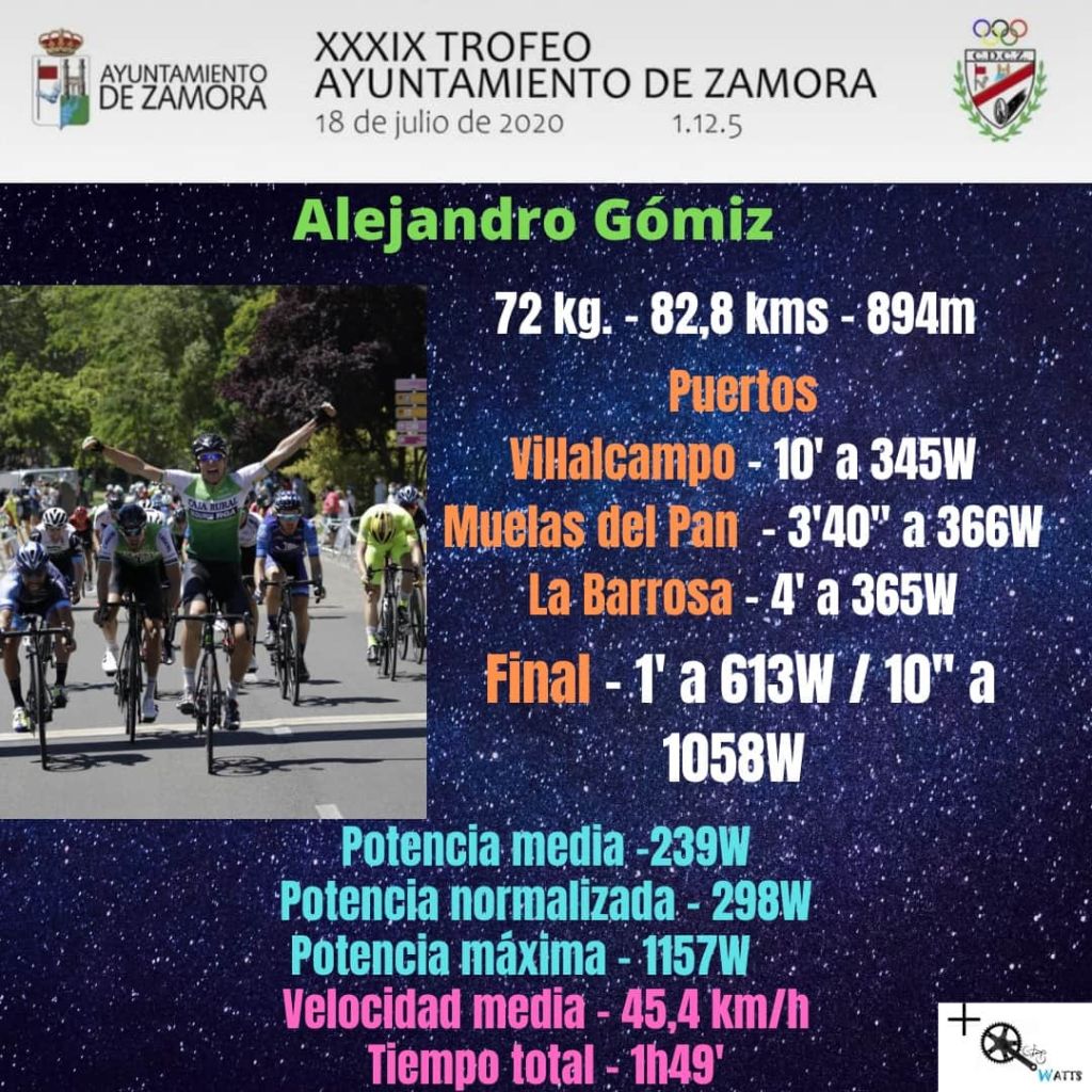 La cuenta de Facebook @másquewatios, que tiene como objetivo divulgar información útil sobre todo lo relacionado con el ciclismo y el entrenamiento, intentando combinar el conocimiento teórico y el práctico, ha ofrecido los datos registrados por Alejandro Gómiz (Filial Caja Rural-Seguros RGA) para conseguir la victoria el pasado sábado en el Trofeo Ayuntamiento de Zamora. A su juicio era «una carrera relativamente corta para la categoría élite-sub 23 que se suele resolver con una llegada masiva donde los hombres rápidos pueden mostrar su potencial».