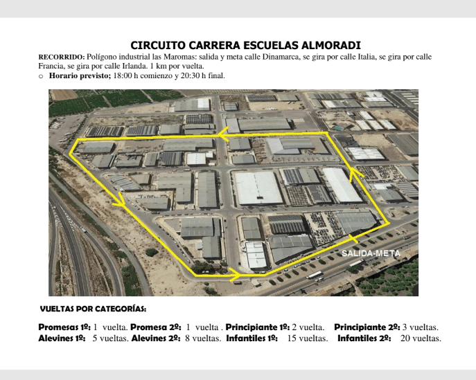 El sábado, día 25 de julio, a partir de las 18 horas, se disputará la XX Reunión de Escuelas de Ciclismo de Almoradí. En un circuito diseñado en el Polígono Industrial Las Maromas de la localidad de la Vega Baja, de un kilómetro y doscientos metros, con calles anchas y bastantes rectas, competirán los promesas 1 y 2 (1 vuelta); principiantes 1 (2); principiantes 2 (3); alevines 1 (5); alevines 2 (8); infantiles 1, (15) e infantiles 2 (20).