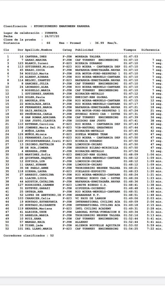 La juvenil del Moreaga Taldea, Inés Cantera, se ha impuesto este mediodía en la Etorkizunezko Emakumeen Karrera (Carrera de las mujeres del futuro), prueba femenina para Sub 23 y Júnior que se ha celebrado en Ia localidad vizcaína de Iurreta-Goiuria. La corredora alicantina del Eneicat RBH Global, Sofía Martínez, ha ocupado el puesto 30, novena en Sub 23, ha afrontado su primera prueba tras el parón provocado por el COVID-19. «Me he encontrado mejor de lo que esperaba», reconocía la ciclista de San Vicente antes de reconocer que «aunque me ha faltado esa chispa que se tiene cuando compites con asiduidad estoy contenta de volver a estar ahí».