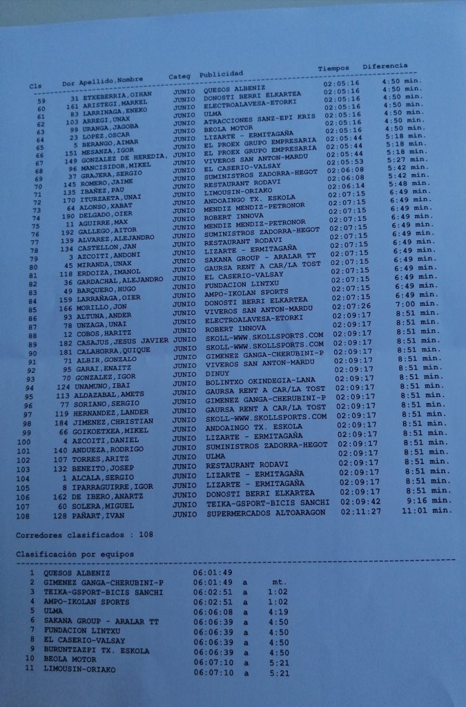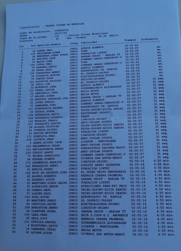 Unai Aznar (Quesos Albeniz) ha logrado el triunfo en el Trofeo Virgen de Muskilda disputado en Ochagavía sobre una distancia 81 kilómetros de recorrido. Buena actuación del equipo sajeño Giménez Ganga. Ha logrado meter en el grupo de los favoritos a dos de sus hombres. Juan Marín ha terminado quinto al esprint (Vídeo de @FundacionLintxu) y Mario Granero séptimo. “Había dos puertos muy duros y la selección se ha hecho en el segundo. He conseguido entrar en el corte bueno y hemos ido a relevos hasta meta”, comenta Marín, mientras que Granero confesaba: «La carrera ha ido bastante rápida y los dos puertos han seleccionado la carrera. Luego, a base de aguantar palos he conseguido meterme con los mejores. Estoy muy contento”.