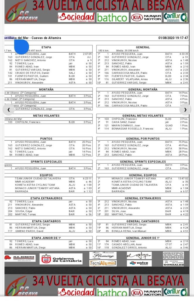 Juan Ayuso es el actual campeón de España y antes del parón había ganado las cinco carreras que había disputado hasta que la campaña se suspendió por culpa del COVID-19. En su palmarés de 2020 las dos carreras de la Copa de España Júnior Cofidis: el Circuito Guadiana y el Memorial Joan Bautista Llorens, además de las otras tres carreras del Trofeo Víctor Cabedo, incluyendo la contrarreloj por escuadras que se adjudicó junto a sus compañeros. Lidera la Copa de España de la categoría y se ha adjudicado el Trofeo Cabedo. Ahora, tras la vuelta a la competición, suma tres nuevas etapas en tierras cántabras. En total, ocho victorias.