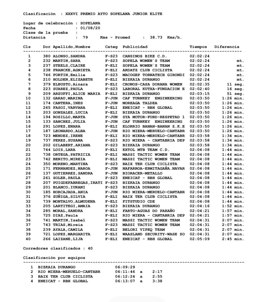 Por su parte, Melisa Gómiz (Vib Sports) se adaptó bien al ritmo del grupo, después de la inactividad, mientras que Sofía Martínez (Eneicat RBH Global) sufrió una caída. «Eran tres vueltas a un circuito y cuando me he caído he entrado en un grupo, pero al final nos ha tirado de carrera. A pensar en mañana», comentaba Sofía. Tampoco terminó la carrera Pilar Jiménez (VIB Sports). La valenciana se vio frenada por una caída de un grupo de ciclistas y ya no puedo coger al grupo de cabeza. El circuito ira rápido y resultaba casi imposible.