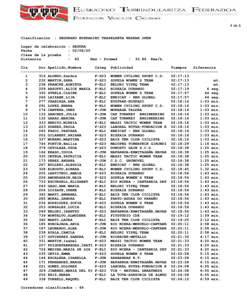 Al igual que el sábado en Segura, Alonso ha superado a Sara Martín (Sopela’s Women Team), aunque en esta ocasión Francke (CC Ardatz) ha sido tercera y Arzuffi (Bizkaia-Durango) cuarta.