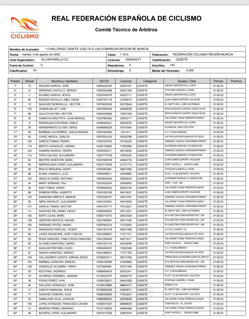 Esta mañana también se ha corrido la primera carrera de la Challenge Cadete Vuelta a las Comarcas Región de Murcia. El triunfo se lo ha llevado el corredor del GD Llopis, José Segura. Le han acompañado en el podio Sergio Serrano (Stefano Garzelli Team) y su compañero de equipo Jesús Alfonso. La victoria se la han disputado al esprint un grupo numeroso de corredores y el reloj se ha parado en la hora, ocho minuto y 33 segundos. Se han inscrito 144 ciclistas. “Ha sido una carrera muy rápida con bastantes ataques, pero como era un circuito de moto. era muy difícil escaparse porque la gente volaba”, comentaba Segura antes de reconoce su satisfacción por el triunfo, “Siempre es bonito volver con un triunfo. No sabía cómo iban a estar los rivales después del parón y me he encontrado bastante bien”, apuntaba Segura.