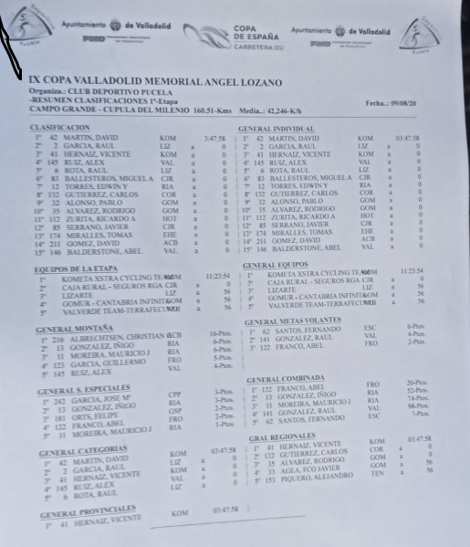David Martín (Kometa) se ha adjudicado el Memorial Ángel Lozano de Valladolid con el que volvía la Copa de España 2020 para corredores élite y sub 23. Ha batido al esprint a Raúl García Pierna (Lizarte) y a Vicente Hernáiz (Kometa) tras parar el reloj en las tres horas, 47 minutos y 58 segundos. El alicantino Tomás Miralles (Electro HíperEuropa), muy activo toda la mañana, ha entrado en el puesto trece. «La carrera ha sido muy nerviosa y con bastante tensión pero por suerte el equipo ha estado de 10, cuidándonos, y al final, pues, ya lo hemos intentado en varias ocasiones, pero todo se ha decidido en un esprint reducido de unas 25 unidades. En general bastante contento por ser la primera después de todo este parón. Ahora a pensar en los nacionales», señalaba el corredor de Orba.
