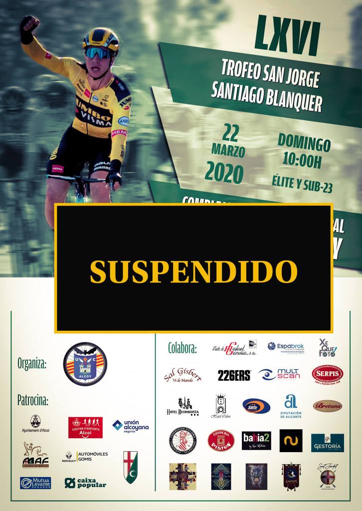 La Unión Ciclista Alcoy, junto con el Ayuntamiento de la ciudad, ha decidido cancelar definitivamente la edición 2020 del LXVI Trofeo San Jorge Santiago Blanquer para corredores élite y sub 23. La prueba estaba fijada para el 11 de octubre, tras quedar aplazada la fecha inicial del 22 de marzo, con un recorrido de 105 kilómetros y más de dos mil metros desnivel. La última edición la ganó Iván Martínez, con el oriolano Javi Gil en segundo lugar.