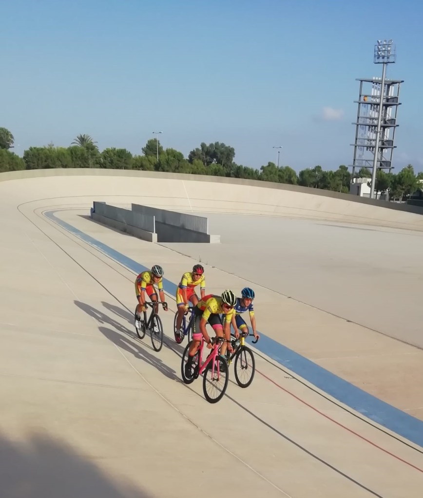 Guillermo Ferrer, seleccionador de la Federación de Ciclismo de la Comunidad Valenciana (FCCV) de Pista, sigue preparando en el velódromo de San Vicente del Raspeig el Campeonato de España de Pista que tendrá lugar en la localidad navarra de Tafalla del 23 al 27 de septiembre. En la reunión de hoy han estado los corredores Joel Villaverde, Abel Olivares, José Segura y Sergio Hernández. “Hemos calentado un rato y después hemos hecho series simulando la puntuación, saliendo de dos en dos a doblar por detrás. Después, hemos hecho dos series de velocidad por equipos”, recuerdan Segura y Villaverde.