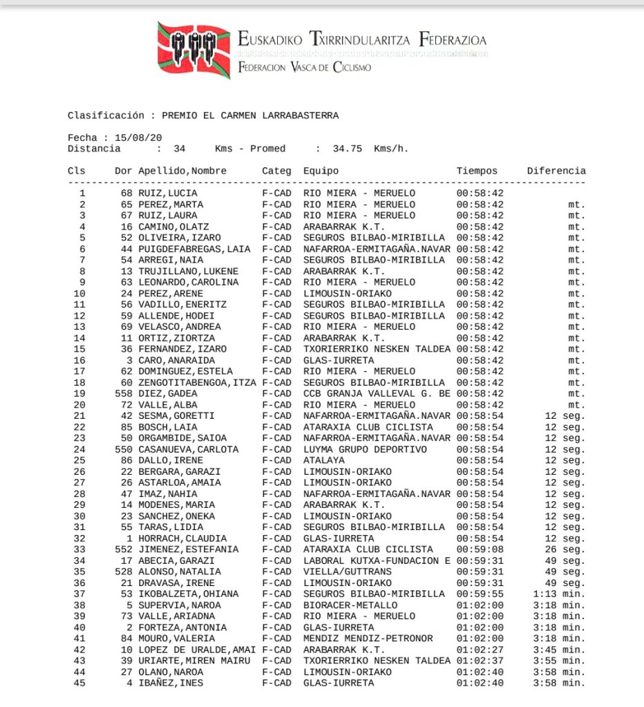Presencia en el pelotón de la almoradidense Melisa Gómiz (Vib Sport), que el lunes también disputa, al igual qe Alonso una contrarreloj individual de 11,3 kilómetros (9:30) entre el Alto Zumeltza (Dima) y Urkiola (Abadiño). Está en luego el título de campeona de Vizcaya de contrarreloj.