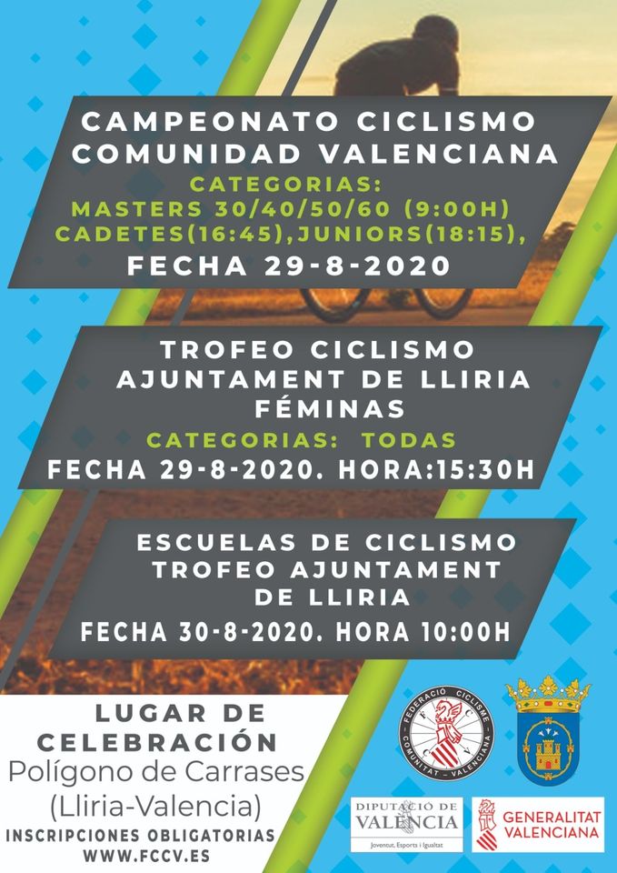 La Federación Valenciana de Ciclismo (FCCV) informa que la localidad de Lliria acogerá el día 29 de agosto los campeonatos autonómicos máster (30, 40, 50 y 60), cadete y júnior. La primera prueba dará comienzo a las nueve de la mañana; la cadete, a las 16.45; y la júnior, a las 18.15. Ese mismo día, a las 15.30, también tendrá lugar el Trofeo Ajuntament de Lliria de Féminas. Las pruebas se realizarán en el Polígono de Carrases de la localidad valenciana. Al día siguiente, a las 10, se disputará una reunión de Escuelas de Ciclismo.