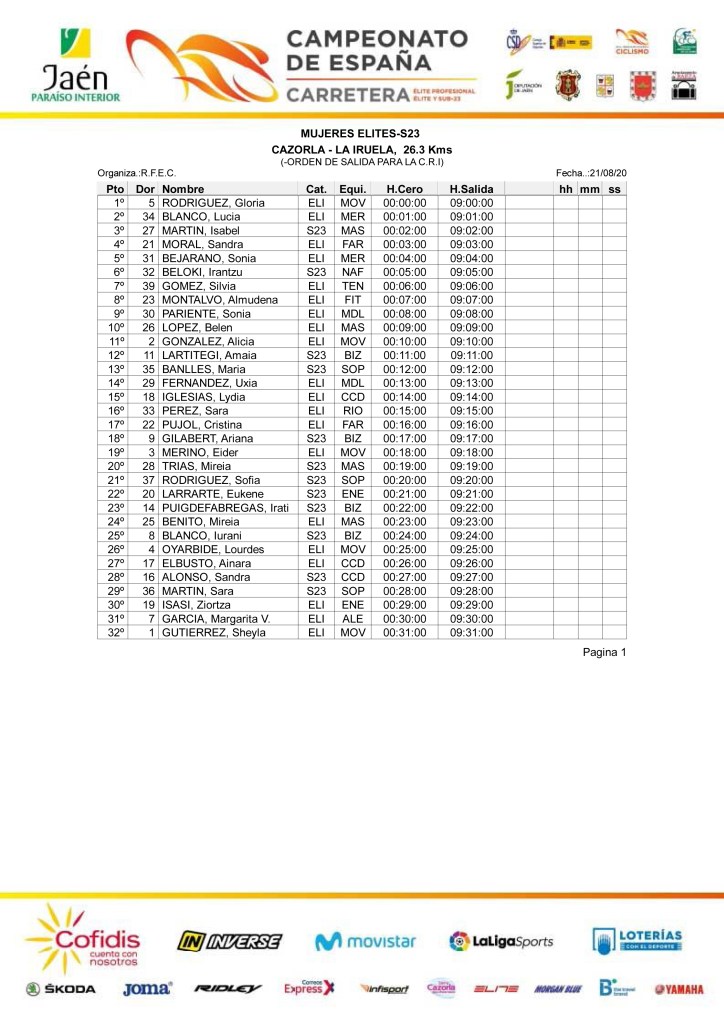 * 9:00 horas / CRI Élite-Sub23 femenina / Cazorla – La Iruela / 26,3 km