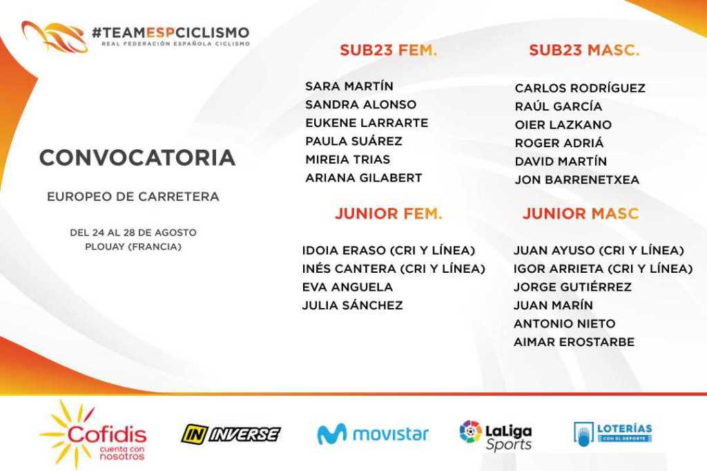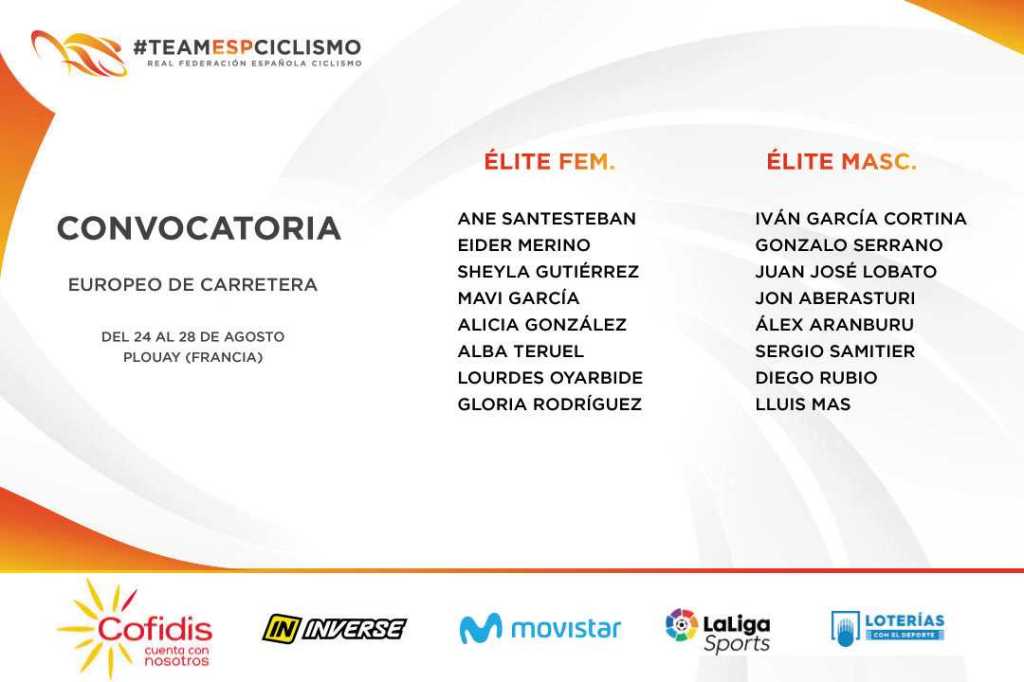Pascual Momparler, seleccionador nacional, ha convocado para la prueba continental a los ciclistas Iván García Cortina (Bahrein-Mclaren), Gonzalo Serrano (Caja Rural-Seguros RGA), Jon Aberasturi (Caja Rural-Seguros RGA), Juan José Lobato (Euskaltel-Euskadi), Álex Aranburu (Astana), Diego Rubio (Burgos BH), Lluis Mas (Movistar) y Sergio Samitier (Movistar).