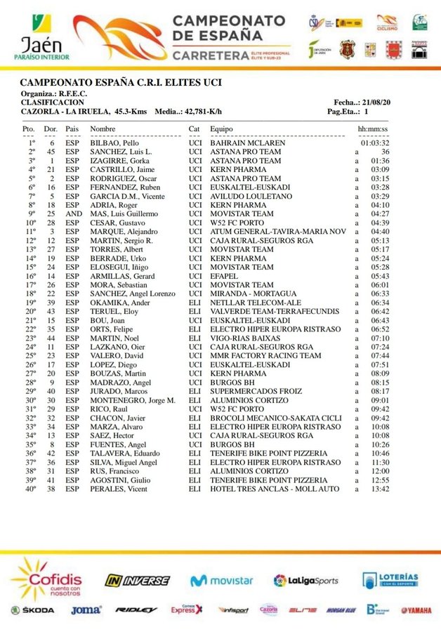 Por su parte, Pello Bilbao (Bahrain-McLaren) se ha proclamado campeón de España contrarreloj élite UCI, en un duro recorrido de 45,3 kilómetros entre Cazorla y La Iruela. Ha batido a Luis León Sánchez, quien aspiraba a su quinto título, y a Gorka Izagirre, ambos del Astana Pro Team.