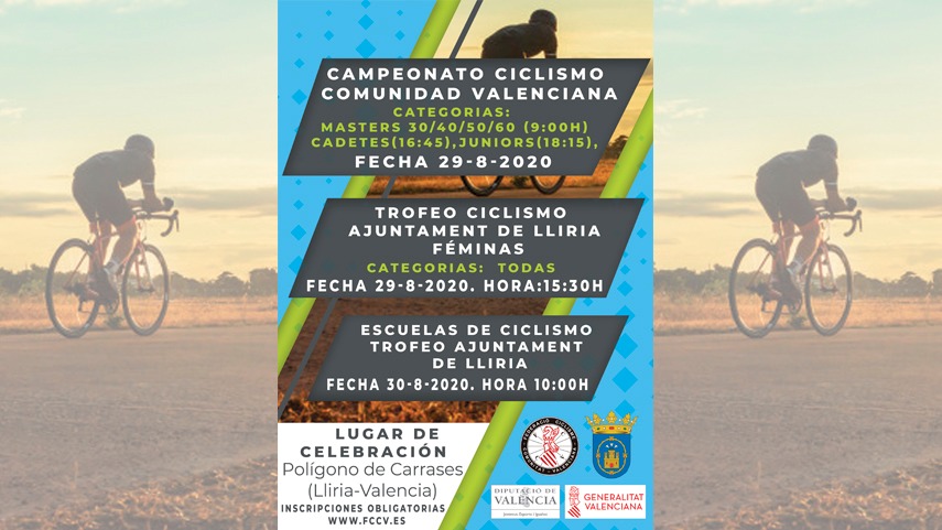 El polígono de Carrases, ubicado en Llíria, será el escenario el próximo sábado 29 de agosto, del Campeonato de la Comunitat Valenciana de ruta para las categorías cadete masculina, júnior masculina y máster masculina. Las pruebas, organizadas por la FCCV, se sucederán en horario matutino y vespertino. Los más madrugadores serán los másters 30, 40, 50 y 60, cuya competición arrancará a las nueve de la mañana. Ya por la tarde, los cadetes correrán a las 16:45 horas y los júniors a las 18:15 horas. El Port Hotels luchará por el título cadete con Alejandro Baviera, Jordi Richmond, Pablo Blanquer, Mario Alvarez, David Martínez, Ivan Nieto, Daniel Pérez, Ivan Tortosa. Aron lasso, Pedro lozano y Mario Samblas. El Zafiro Team estará con Pablo Galvañ, José Cano y Adrián Hernández. Con Pedro González y José Vidal de directores el resto de la plantilla del Giménez Ganga que no compita en tierras cántabras o vascas disputará el autonómico júnior. Destacar que Mario Granero, que corre en Beasain, no defenderá el título logrado el pasado año en Ja´vea.