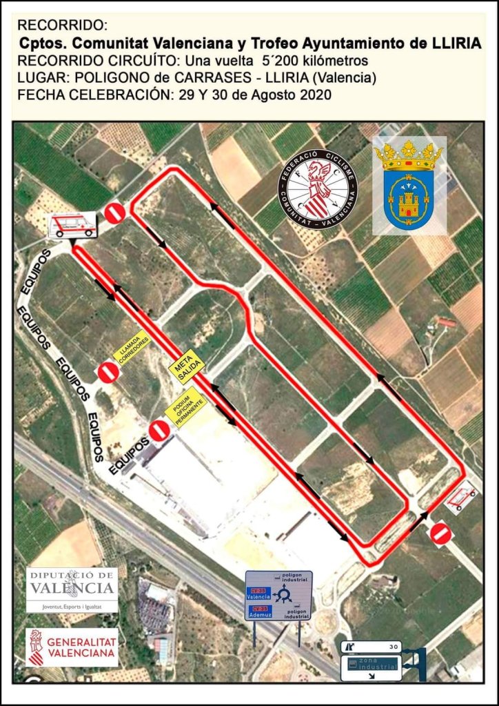 El polígono de Carrases, ubicado en Llíria, será el escenario hoy sábado, día 29 de agosto, del Campeonato de la Comunitat Valenciana de ruta para las categorías cadete masculina, júnior masculina y máster masculina. Las pruebas, organizadas por la FCCV, se sucederán en horario matutino y vespertino. Los más madrugadores serán los másters 30, 40, 50 y 60, cuya competición arrancará a las nueve de la mañana. Ya por la tarde, los cadetes correrán a las 16:45 horas y los júniors a las 18:15 horas.