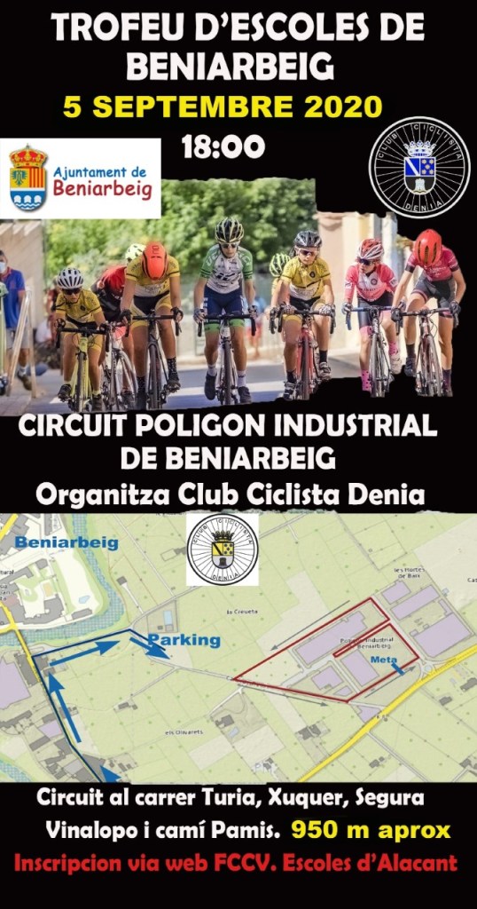 El sábado, día 5 de septiembre, a partir de las 18 horas, se disputará el Trofeu D’Ecoles de Beniarbeig organizado por el Club Ciclista Dénia y patrocinado por el Ayuntamiento de la localidad alicantina. Cerrada la inscripción este mediodía ya se conoce que serán 112 ciclistas de la provincia de Alicante los que participarán en dicha carrera que coge el relevo de las disputadas en Tibi y Almoradí una vez se abrió la veda a las pruebas de Escuelas, tras el parón provocado por el Covid-19. Se espera que el tiempo acompañe y los pequeños puedan disfrutar de una jornada de ciclismo. Como se recordará, la carrera se suspendió el pasado 29 de agosto por la lluvia. El esfuerzo del Club Ciclista Dénia y del Ayuntamiento de Beniarbeig han hecho realidad el hecho de que la prueba se pueda disputar siete días después.