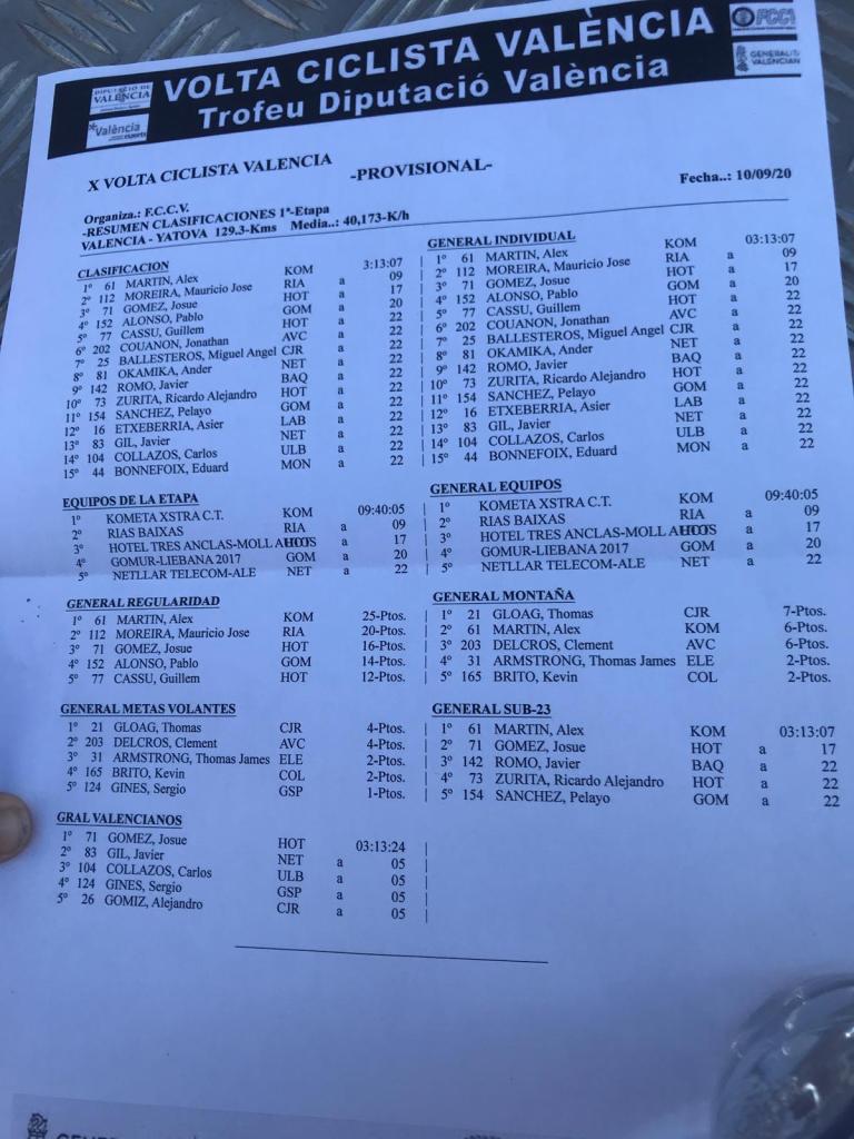 Álex Martín (Kometa-Xstra) se ha impuesto en la primera etapa de la Volta Ciclista Provincia de València élite y sub23, que se ha disputado entre la capital del Turia y Yátova, de 129,3 kilómetros. El catalán ha logrado una victoria en solitario tras parar el reloj en las 2 horas, 13 minutos y siete segundos. Atacó a 25 kilómetros de meta y pese al trabajo del Lizarte no se pudo impedir que llegara a meta como vencedor. A nueve segundos entró Mauricio Moreira, mientras que el alicantino Josué Gómez (Hotel Tres Anclas) era tercero a 17. Guillem Casau, a 22, dio tiempo al pelotón en el que Ander Okamika, del equipo alicantino Netllar Telecom Alé era octavo y su compañero de equipo Javi Gil ocupaba la posición número trece. Y Carlos Collazos, del UlbSports Safir Fruits, el 14. «El equipo ha estado trabajando bien y dentro de lo previsto», señalaba el director del equipo alcoyano José Vicente Peidró.