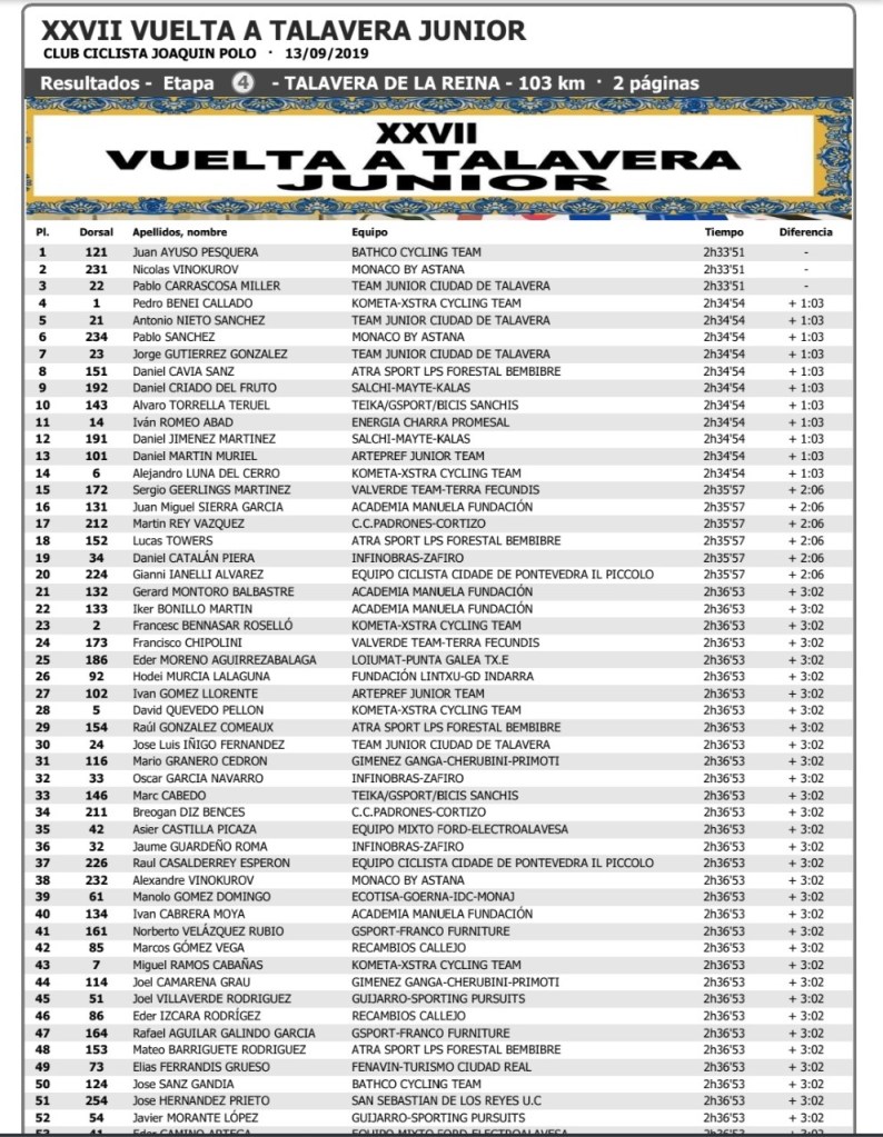 Juan Ayuso (Bathco) ha redondeado el círculo y ha conseguido la victoria en las cuatro jornadas de la Vuelta a Talavera júnior, incluida la contrarreloj por escuadras que logró junto a sus compañeros el sábado. El xabiense ha firrmado hoy el triunfo en la jornada final con principio y fin en Talavera de la Reina. Ha superado en la línea de meta, tras dos horas, 33 minutos y 51 segundo, a Nicolás Vinokurov (Mónaco) y Pablo Carrascosa (Ciudad del Talavera). A tres segundos, en cuarto lugar, ha entrado el también alicantino Pedro Beneit (Kometa). Daniel Catalán (Infinobras), ha ocupado el puesto 19.