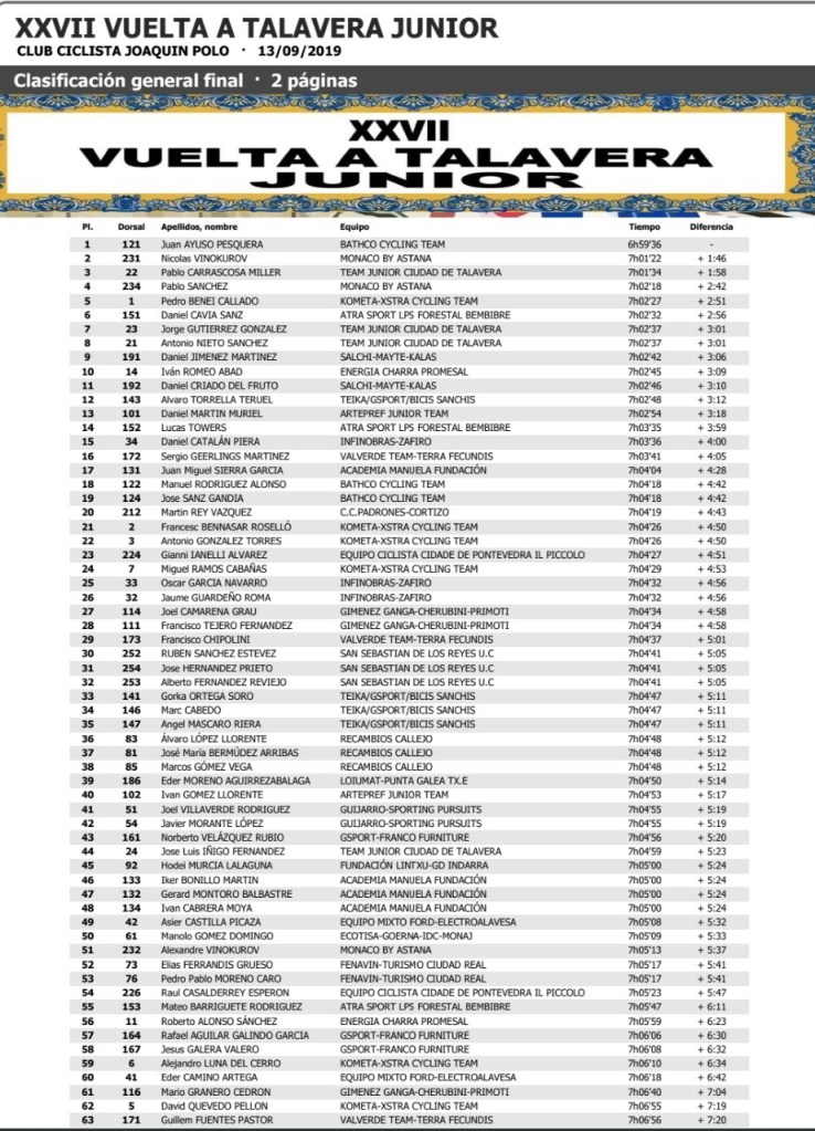 Juan Ayuso se ha adjudicado la general final con un tiempo de seis horas, 59 minutos y 36 segundos. Vinokurov ha sido segundo y Pablo Carrascosa, tercero. Quinta plaza para Pedro Beneit. Buen trabajo de los equipos alicantinos Giménez Ganga, Infinobras Zafiro Team y Guijarro Sporting Pursuits.