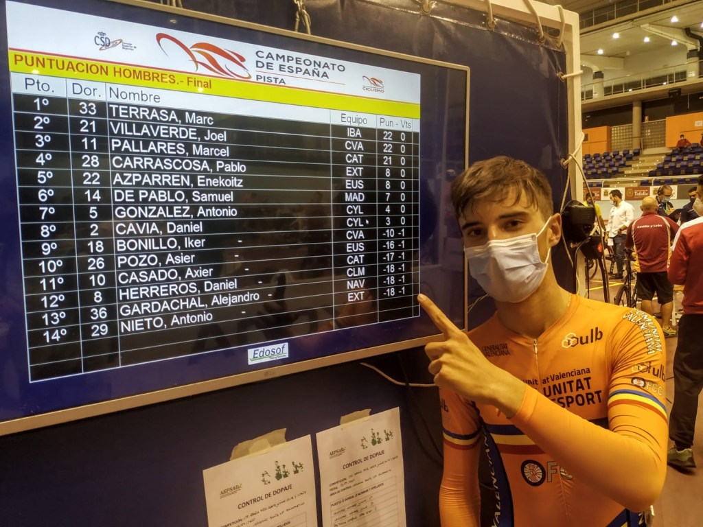 Por su parte, el alicantino Joel Villaverde se colgó la plata en puntuación después de ser oro por la mañana en persecución por equipos júnior junto a Abel Olivares, Iker Bonillo y Gerard Montoro. “Sabía que la carrera había que lucharla desde el principio. Constaba de 100 vueltas (25km) con sprints intermedios. Debido a que la prueba era bastante larga hemos empezado con bastante calma. Mi compañero Iker Bonillo ha sufrido una caída. Por suerte ha podido seguir y acabar la prueba. Le tengo que dar las gracias por el trabajazo que ha hecho para poder estar yo en podio. Al ver que la gente buena esprintaba, desde el primer esprint, me he tenido que poner las pilas y estar delante. He luchado para poder doblar al pelotón y conseguir los 20 puntos. Me he ido con Marc Terrassa (Baleares) y Pallares (Catalunya) y unos cuantos más. Eran gente muy buena. Había ganado ya varios esprines, pero sabía que era muy difícil ganarle a Terrassa al final. Lo he intentado varias veces pero han estado muy atento. Un segundo puesto, empatado con el primero, me sabe a gloria”. A juicio del seleccionador «Joel se merecía el oro porque ha hecho una carrera de puntos espectacular, atento a todos los movimientos, y puntuando en los esprints. Al final se ha quedado empatado a puntos con el balear, que entró delante en el último esprint».