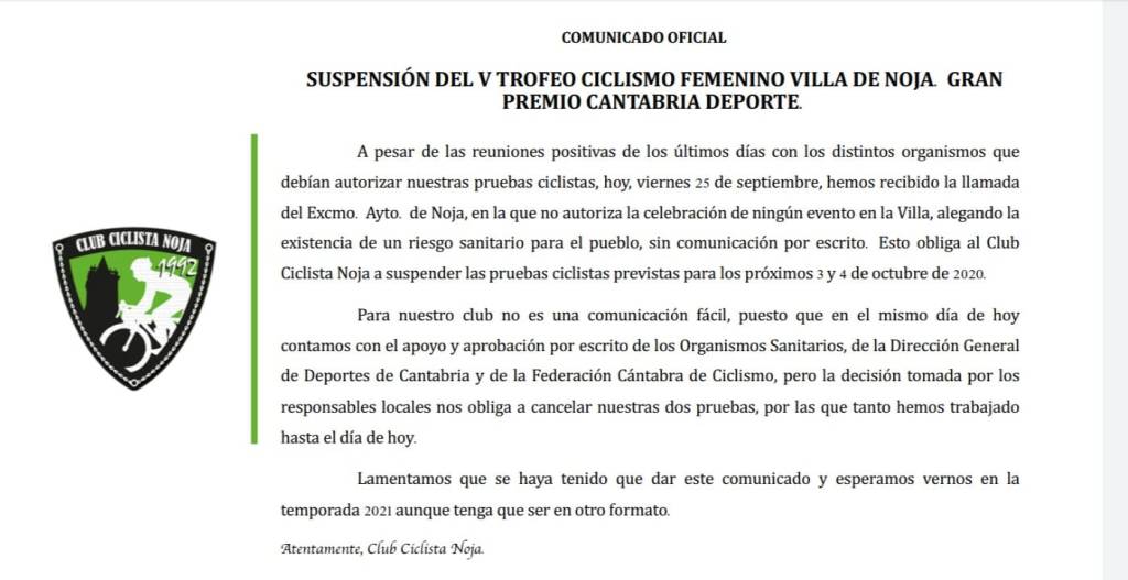 El Club Ciclista de Noja ha anunciado la suspensión definitiva del V Trofeo Ciclismo Femenino Villa de Noja, Gran Premio Cantabria Deporte, prueba valedera para la Copa de España Féminas, que estaba prevista para el 4 de octubre. En un comunicado, la entidad organizadora explica que “el Ayuntamiento no autoriza la celebración de ningún evento en la Villa, alegando la existencia de un riesgo sanitario para el pueblo, sin comunicación por escrito. Esto obliga al Club Ciclista Noja a suspender las pruebas previstas para los próximos 3 y 4 de octubre de 2020”.