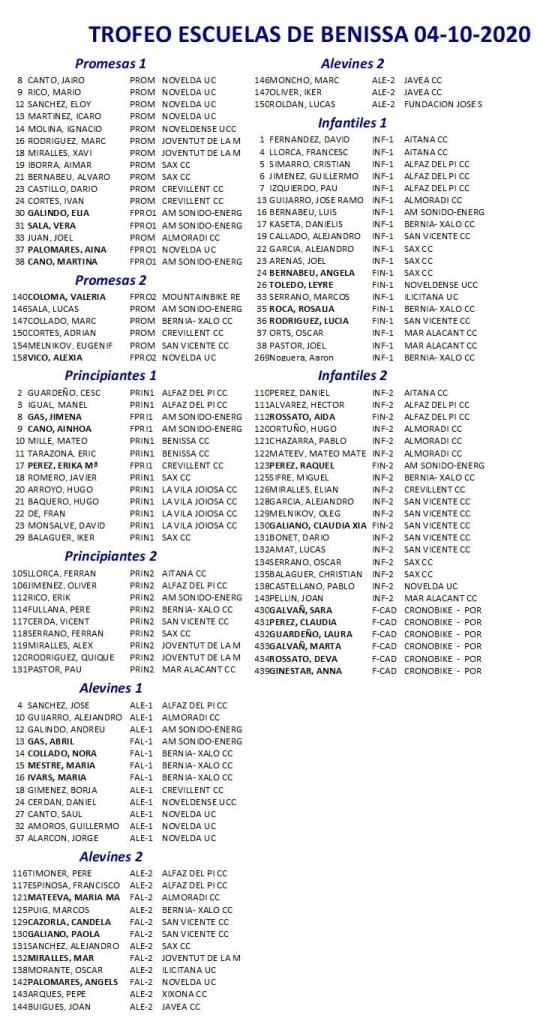 Benissa cierra la temporada 2020 de Escuelas de Ciclismo en la matinal de este domingo, a partir de las 10 horas, con la disputa del Memorial Alejandro Jaén. 114 escolares serán de la partida en el exigente recorrido de mil metros del Polígono de la Pedrera de Benissa. Será el colofón a una campaña que quedó truncada por la pandemia del Covid-19 en el mes de marzo, pero que poco a poco fue levantando la cabeza a medida de que varios clubes de la provincia y sus ayuntamientos se decidieron a organizar pruebas, siempre dentro del protocolo exigido por Sanidad.