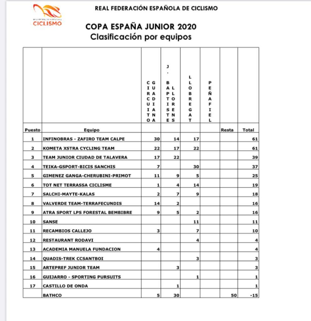 La Real Federación Española de Ciclismo (RFEC), a petición del Infinobras Zafiro Team Calpe, ha rectificado la clasificación por escuadras de la Copa de España Júnior. Tras colocar al Kometa como líder, después de la Cursa Ciclista de Llobregat disputada el pasado domingo, ha tenido que situar en lo más alto al equipo calpino. Ambos conjuntos suman 61 puntos, tras la disputa de tres carreras, pero, tal como argumentó la entidad alicantina «desempatan los primeros puestos y nosotros tenemos uno». Fue en el Circuito Guadiana, disputado en Don Benito antes del parón provocado por la pandemia, cuando el Infinobras Zafiro Team Calpe subió a lo más alto del podio con dos segundos de ventaja sobre el Kometa Xstra Cycling Team. Álex José Parres fue séptimo, Óscar García entró en el puesto 15 y Pablo Galván en el 19.