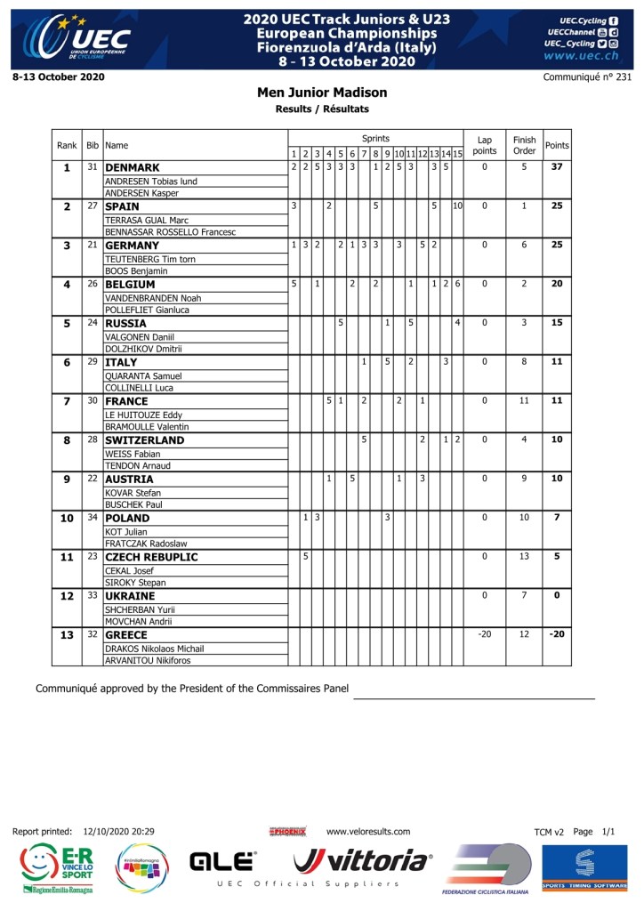 El corredor del Giménez Ganga Cherubini Primoti, Marc Terrasa, formando pareja con Francesc Bennassar, se han hecho con la plata en la prueba de Madison júnior. Han terminado segundos con 25 puntos tras ganar el último esprint. El oro ha sido para los daneses Andresen y Ardersen y el bronce para los alemanes Teutenberg y Boos.