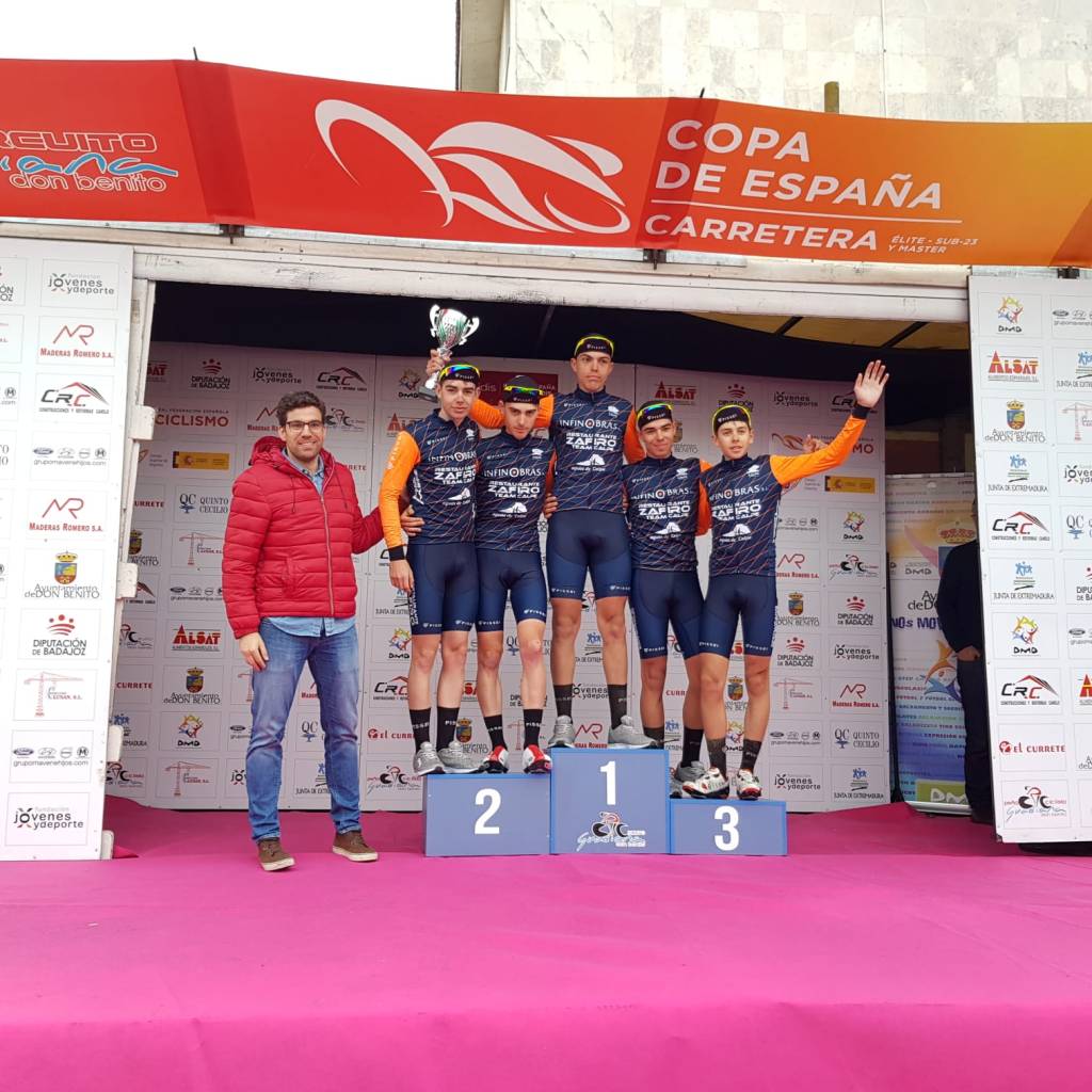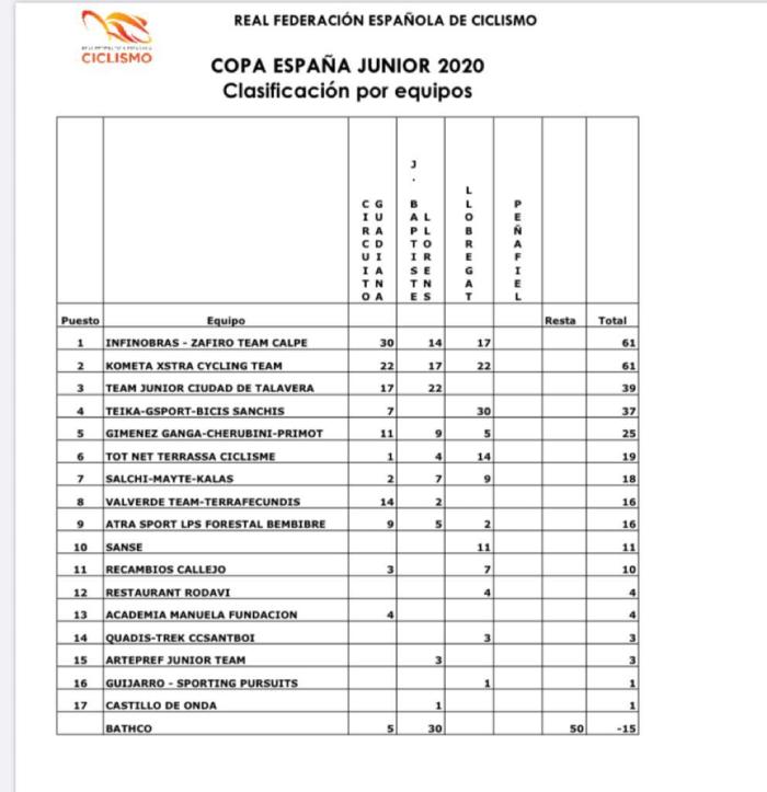 Por su parte, el equipo Infinobras Zafiro Team Calpe es el ganador del premio por escuadras, por delante del Kometa. Los dos suman 61 puntos, pero cuenta a favor del combinado alicantino su primer puesto logrado en Don Benito para el fijar el desempate. En su primera campaña en la categoría han llegado a lo más alto del podio. Todo un éxito. «Ha sido un año complicado, por la crisis del COVID-19, hemos competido en todas las carreras que hemos participado, dando siempre una gran imagen de equipo. La victoria por equipos en Copa, no es una casualidad, es fruto de la regularidad y gran nivel ofrecido el equipo en las tres competiciones. Muy contentos de esta victoria, competíamos contra grandes equipos y nos da mucha confianza de cara al futuro, seguiremos trabajando la base como siempre, priorizando la formación y la educación de personas, para ser mejores ciclistas en el futuro, pero ahora respaldados y con la confianza que nos da esta gran victoria por equipos», dice Salvador Mahiques, uno de los directores del club calpino.