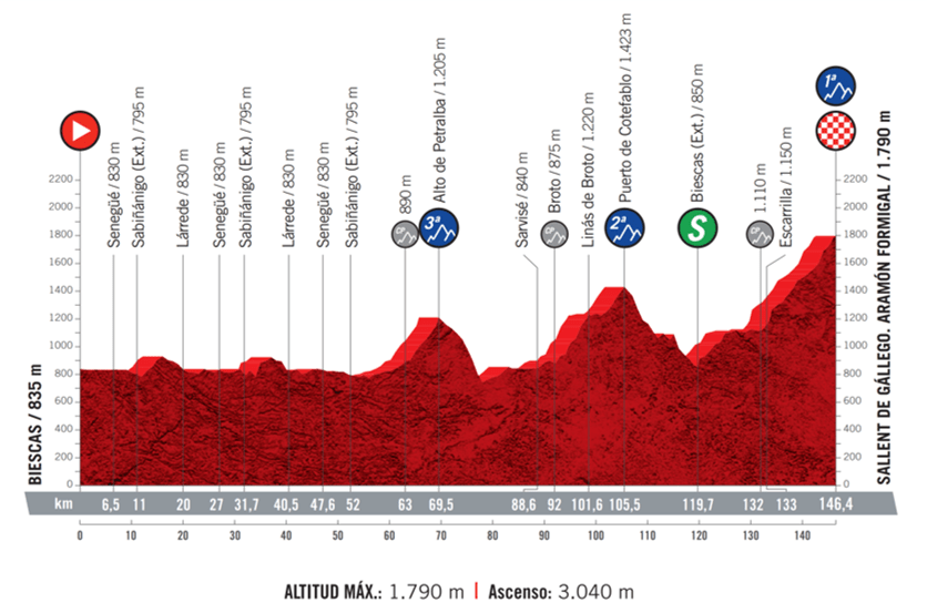 Y mañana domingo, para cerrar el primer bloque de La Vuelta, un nuevo final en alto, distinto al originalmente previsto en el Tourmalet pero igualmente interesante: Formigal (1ª), con sus irregulares 14 km de ascensión y sus tramos finales de hasta el 9%, vendrá precedido por Petralba (3ª; vertiente del descenso final de hoy) y Cotefablo (2ª) en una jornada de 146 km que, hace cuatro años ya decidió LaVuelta.