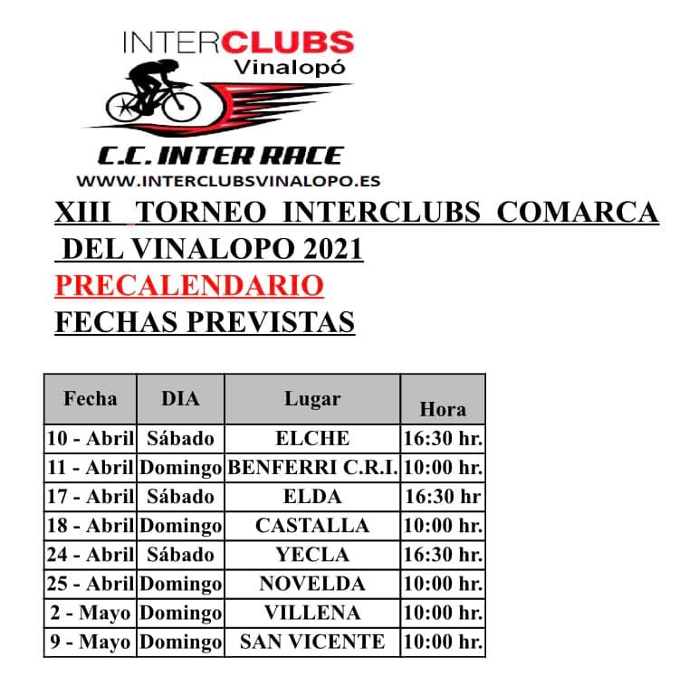 La organización del Torneo Interclubs Vinalopó ha decidido posponer la realización de la edición número trece a los meses de mayo y abril «siempre que para esas fechas todo esté en mejores circunstancias” desde el punto de vista sanitario. La idea inicial era que comenzará el 2 de enero en Elche y contara con ocho etapas, siete en línea y una en la modalidad de contrarreloj, que iba a tener lugar en Benferri. Novelda, Castalla, Elda, Yecla, Villena y San Vicente del Raspeig iban a acoger el resto de las jornadas ciclistas del torneo. Ahora, se ha fijado el 10 abril como primera carrera del Torneo, en Elche, y luego se correrá en Benferri una CRI (11 de abril), Elda (17), Castalla (18), Yecla (24), Novelda (25), Villena ( 2 de mayo) y San Vicente (9).