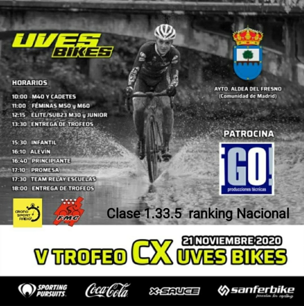 El V Trofeo de Ciclocross UVES Bikes-Ayuntamiento de Aldea del Fresno dará el banderazo de salida a esta atípica temporada en la Comunidad de Madrid. El 21 de noviembre se correrá esta carrera puntuable en el ranking de la Real Federación Española de Ciclismo (RFEC) y son muchos los ciclistas de la Comunidad Valenciana los que desean estar en la prueba ante la falta de competiciones por el tema del Covid-19.