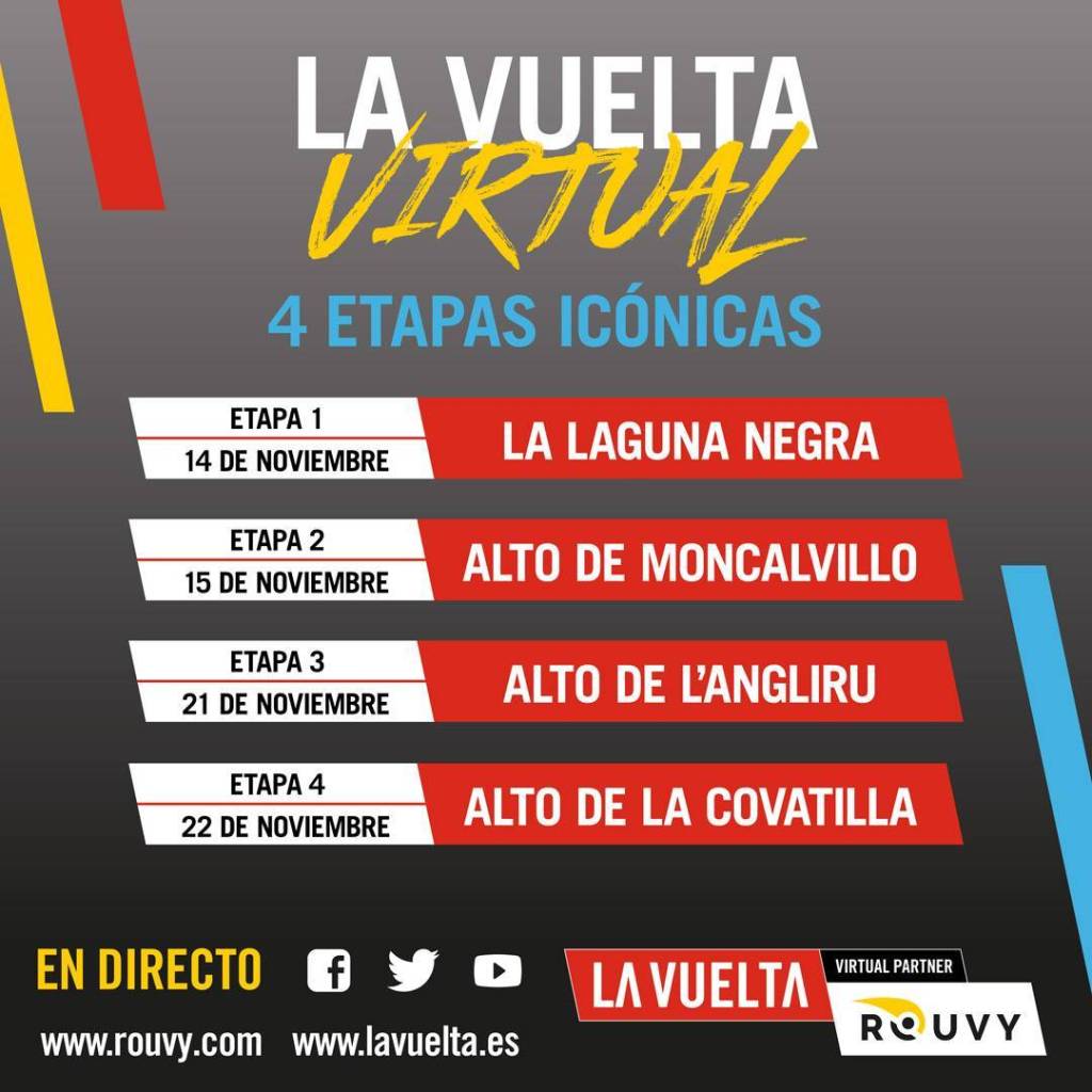 ROUVY, empresa checa de entrenamiento ciclista indoor, y Unipublic, empresa organizadora de La Vuelta, pondrán en marcha este fin de semana la primera edición de La Vuelta Virtual by ROUVY. La plataforma ofrecerá a sus usuarios la posibilidad de disputar el final de cuatro de las etapas más emblemáticas de la última edición de La Vuelta, que finalizó el pasado domingo 8 de noviembre. Las inscripciones se recogerán a través de la web race.rouvy.com.